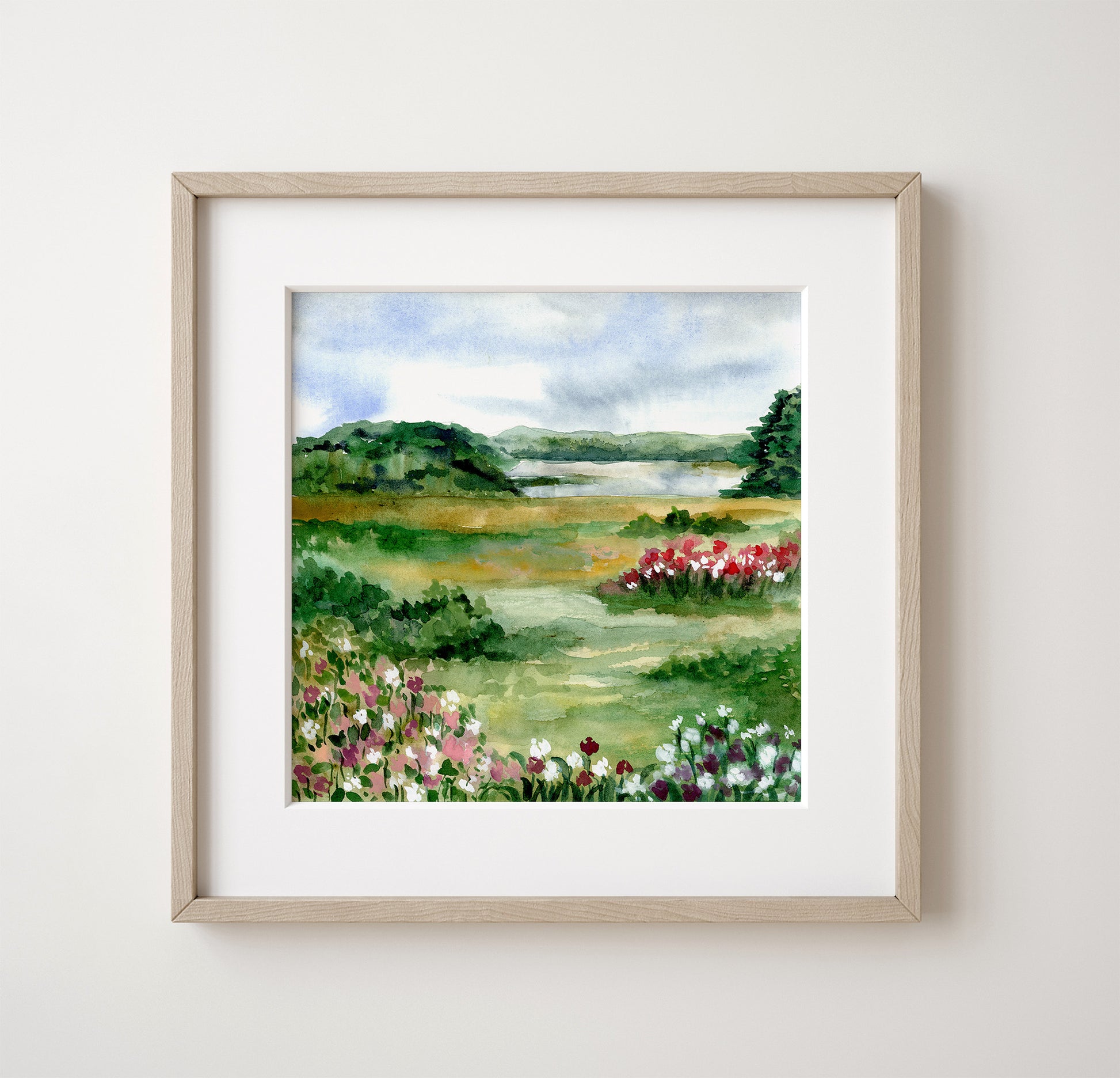 Immerse yourself in the tranquil charm of nature with 'Morning in Bloom', an original watercolour painting that captures a lush green garden in full bloom. Delicate brushstrokes bring vibrant flowers to life, while a serene lake shimmers gently in the distance, inviting quiet reflection. This piece evokes the peaceful harmony of a secluded garden retreat and is perfect for lovers of botanical art, landscape paintings, and watercolour collectors. Measured 30x30cm and created by artist Aiai Webberley, this framed painting is the perfect addition to elevate any space.